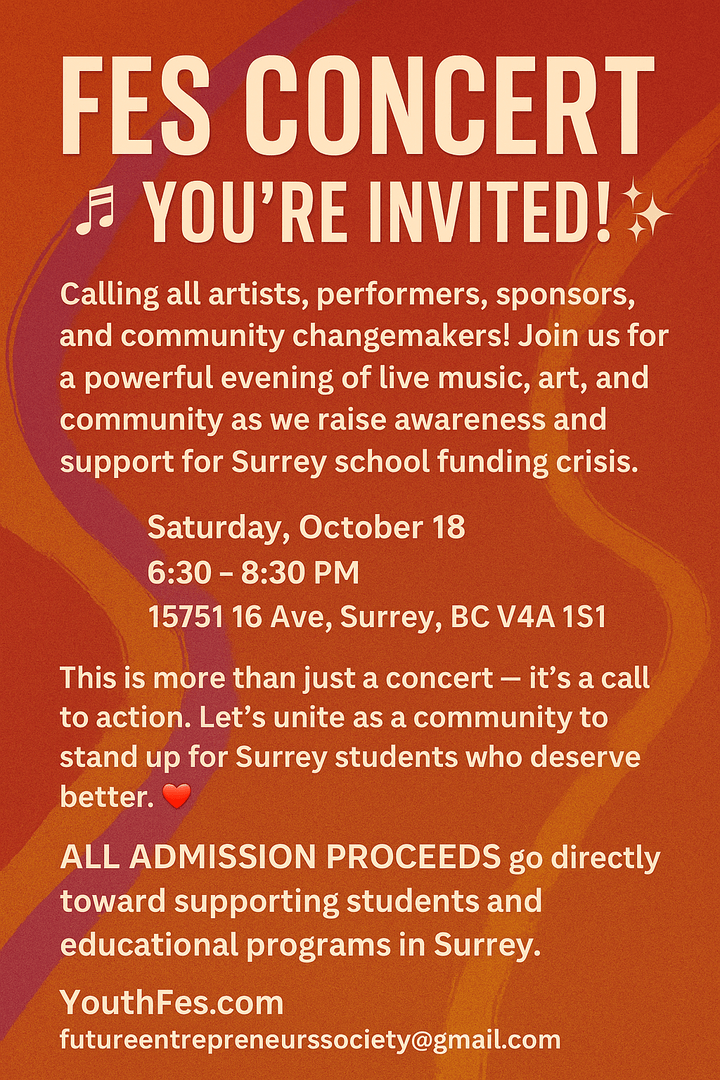 Calling all artists, performers, sponsors, and community changemakers! Join us for a powerful evening of live music, art, and community as we raise awareness and support for the Surrey school funding crisis. 📚