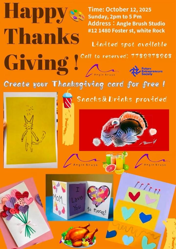 Join us for a fun and creative Thanksgiving celebration at Angle Brush Studio in White Rock! Participants will have the opportunity to design and create their very own Thanksgiving cards – for free!